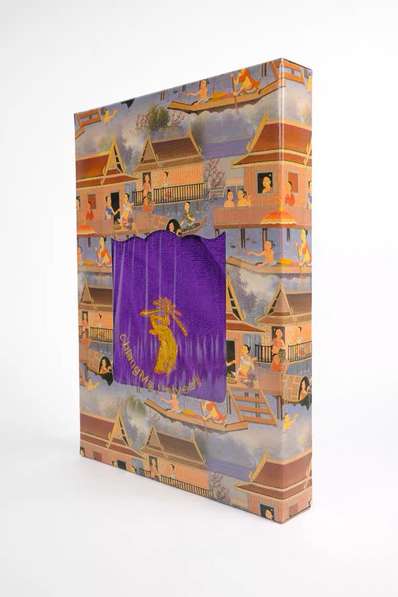 布料面料柔软舒滑,触感细腻,金色的印花象征着清迈大学的标志,传承着清迈大学的传统文化和精神内涵。浴巾外部礼盒的包装设计也极具特色,是泰国兰纳人民的传统文化生活缩影图,有的人可以送一份精美、实用的礼物送给亲朋好友。
