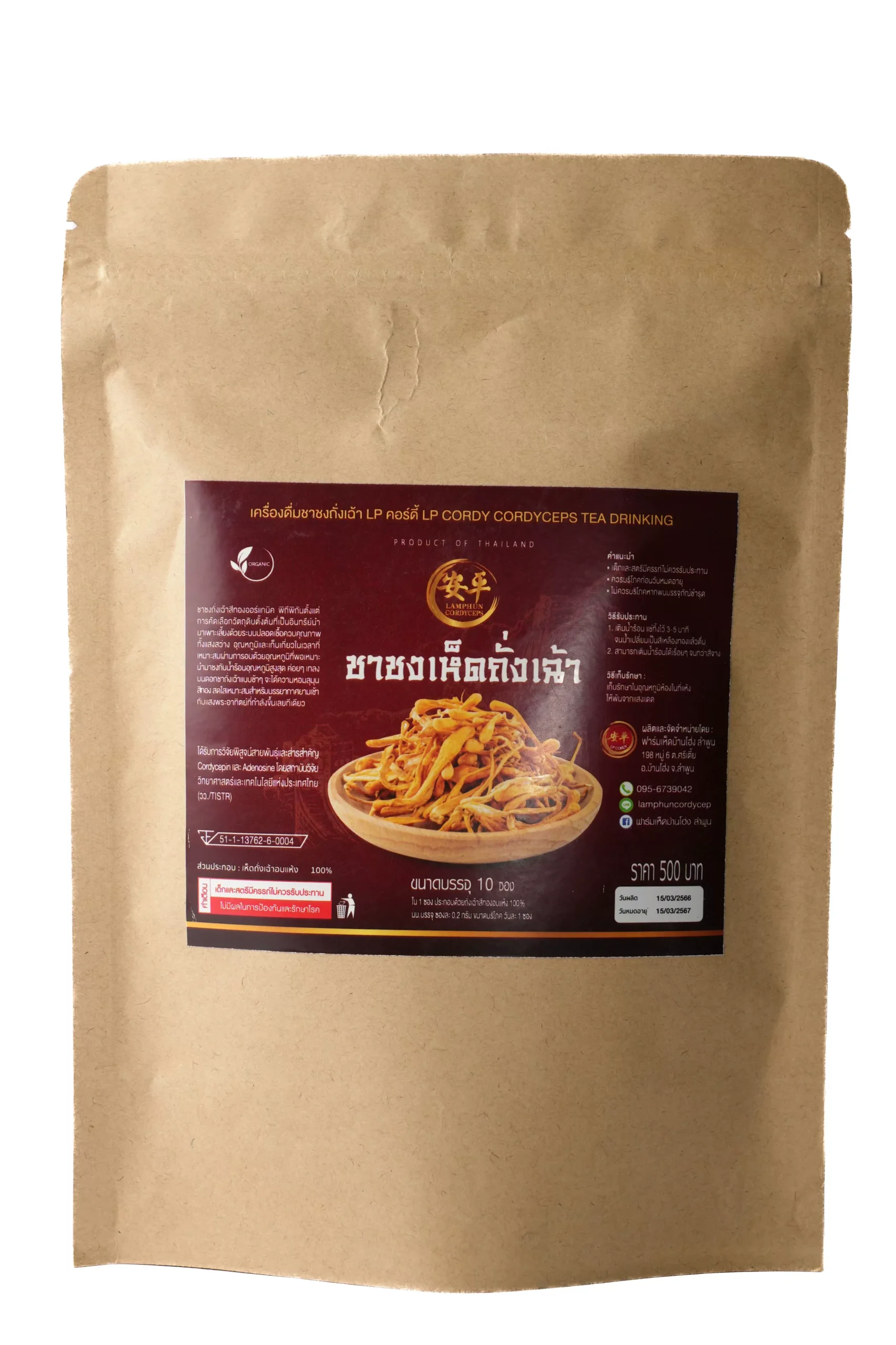 Cordyceps tea, which helps to increase oxygen content and nourish the body, has been studied, verified strains and analyzed by the Thai Institute of Science and Technology (TISTR) for important substances cordycepin and glandulin. Ingredients :100% cordyceps sinensis.